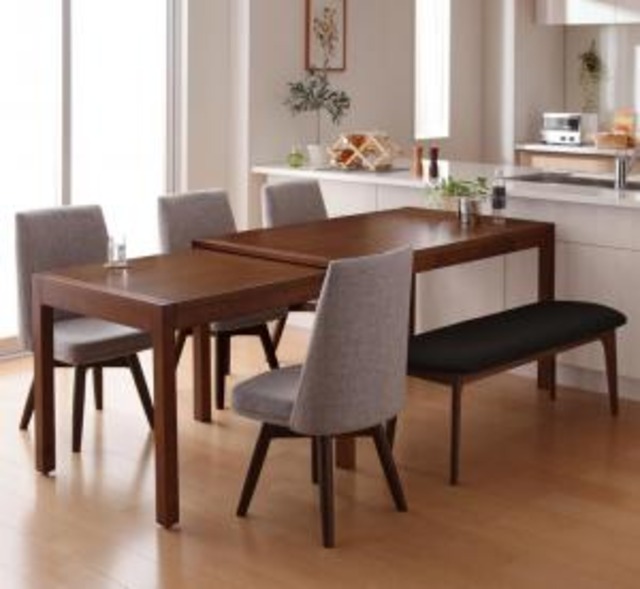 回転イス付き ウォールナット3段階伸縮ダイニングセット 6点セット(テーブル+チェア4脚+ベンチ1脚) W120-180