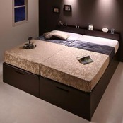 組立設置付 棚・コンセント付き国産大型サイズ頑丈跳ね上げ収納ベッド 薄型抗菌国産ポケットコイルマットレス付き 縦開き キング(SS+S)