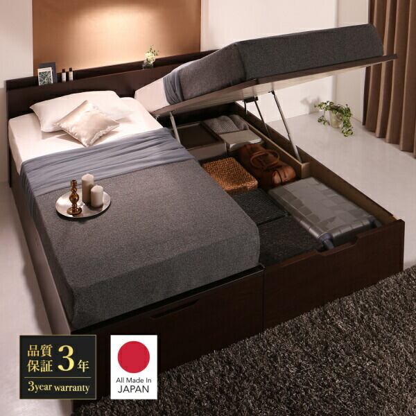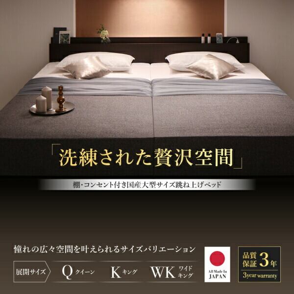 組立設置付 棚・コンセント付国産大型サイズ跳ね上げ収納ベッド 薄型抗菌国産ポケットコイルマットレス付き 縦開き キング(SS+S)