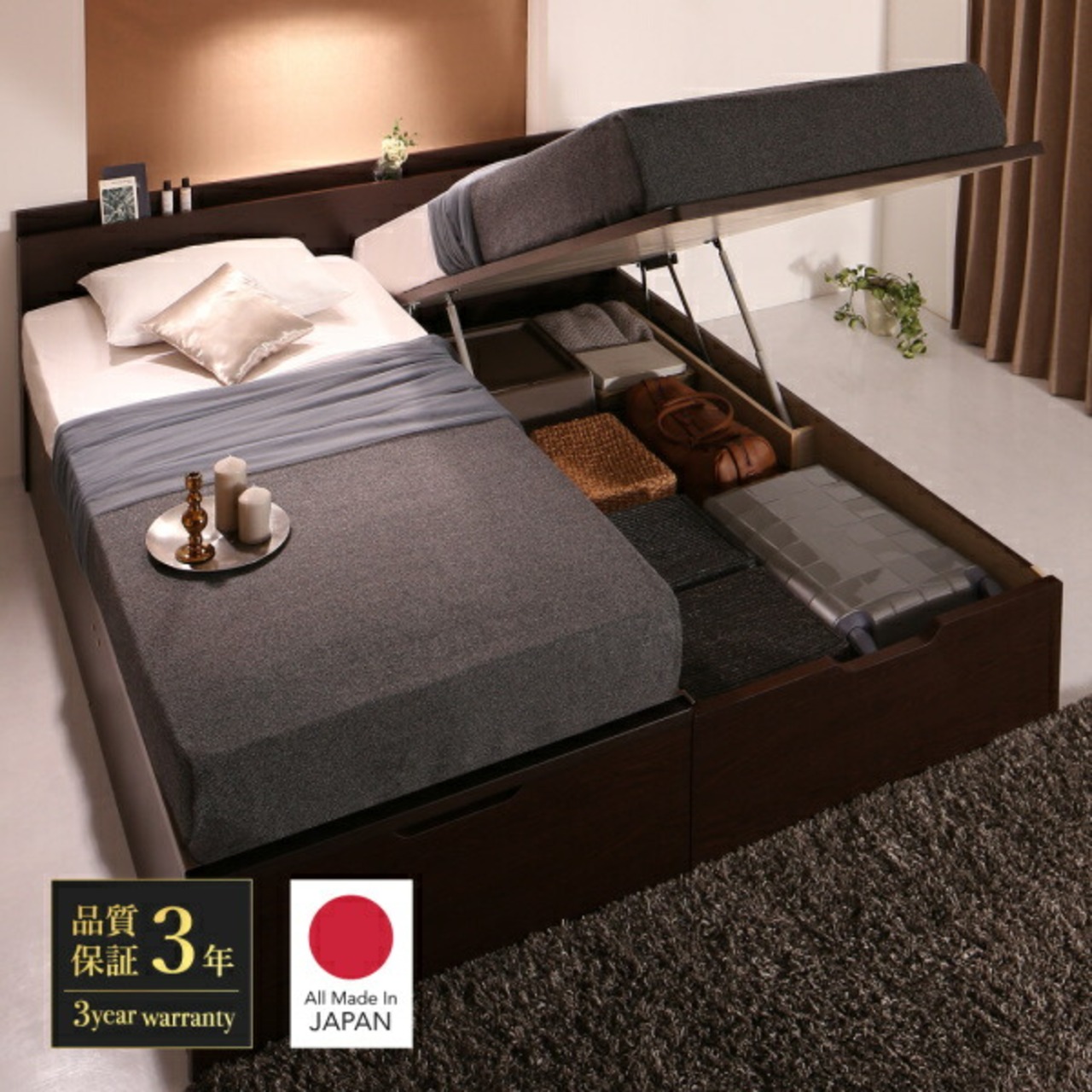組立設置付 棚・コンセント付国産大型サイズ跳ね上げ収納ベッド 薄型抗菌国産ポケットコイルマットレス付き 縦開き ワイドK200