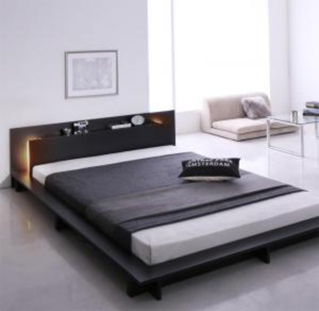 モダンライト・コンセント付きローベッド プレミアムボンネルコイルマットレス付き セミダブル 組立設置付