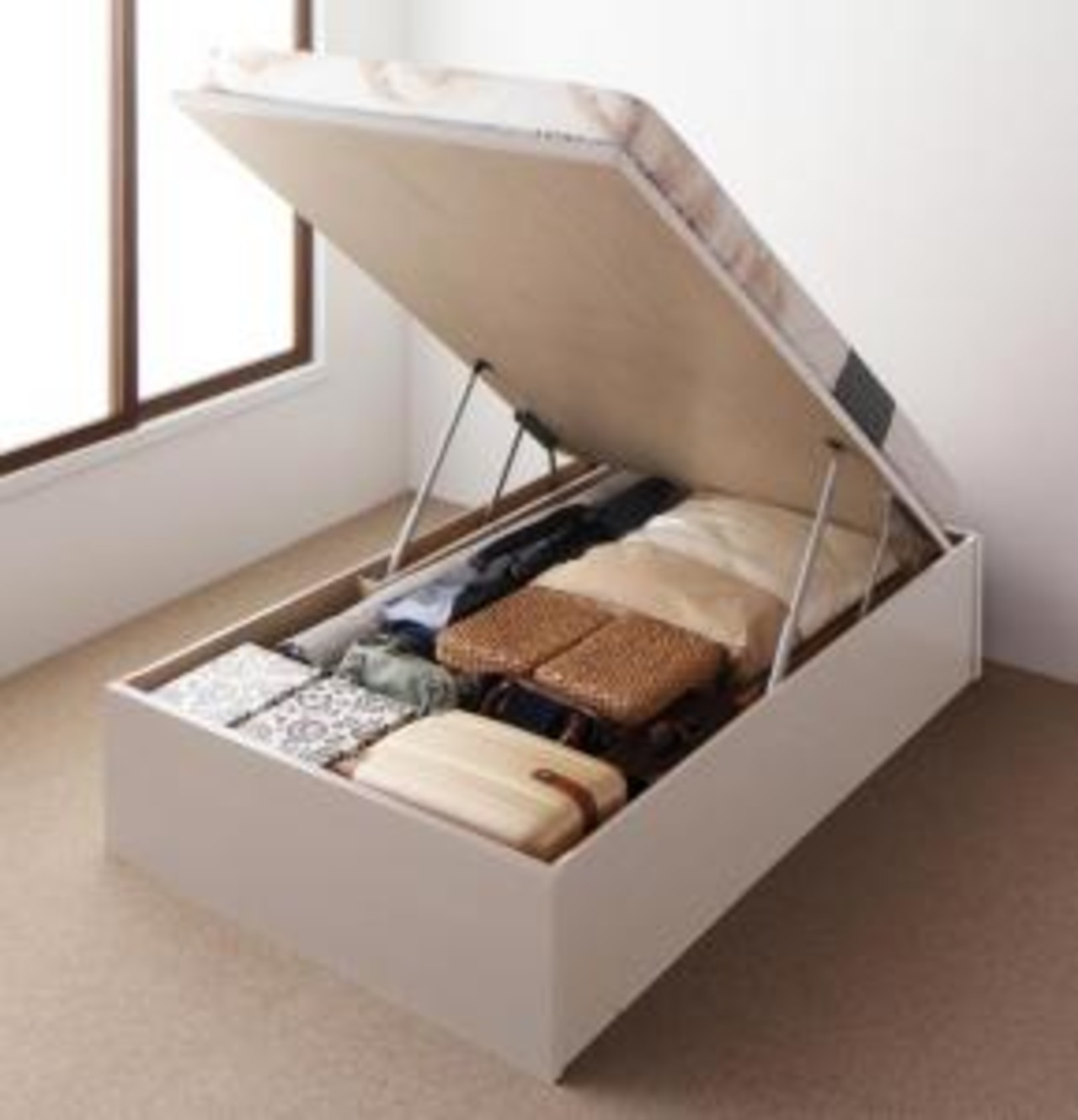 お客様組立 国産跳ね上げ収納ベッド マルチラススーパースプリングマットレス付き 縦開き セミシングル 深さグランド