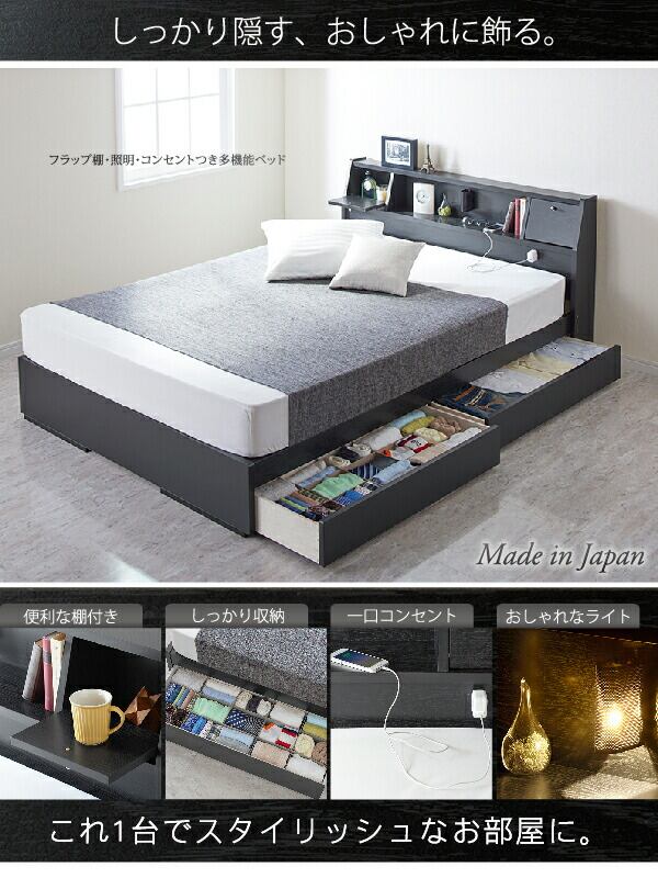 フラップ棚・照明・コンセントつき多機能ベッド 国産ポケットコイルマットレス付き シングル