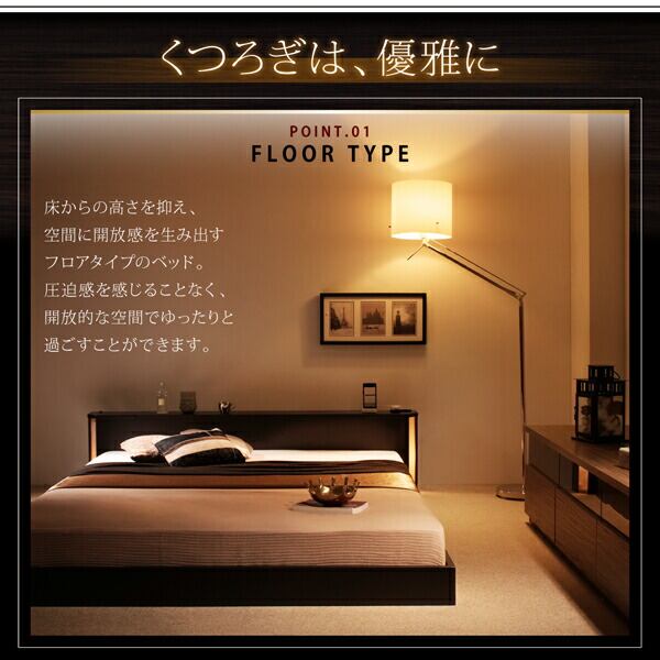モダンライト・コンセント付きフロアベッド プレミアムポケットコイルマットレス付き ダブル