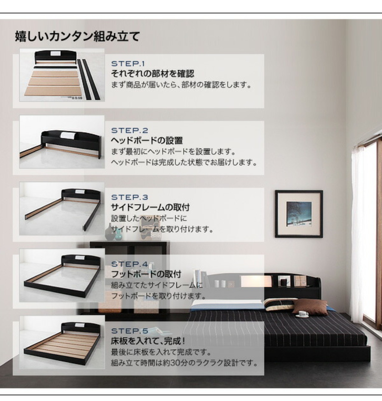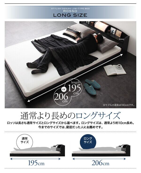 照明・棚付きフロアベッド 国産ポケットコイルマットレス付き ダブル レギュラー丈