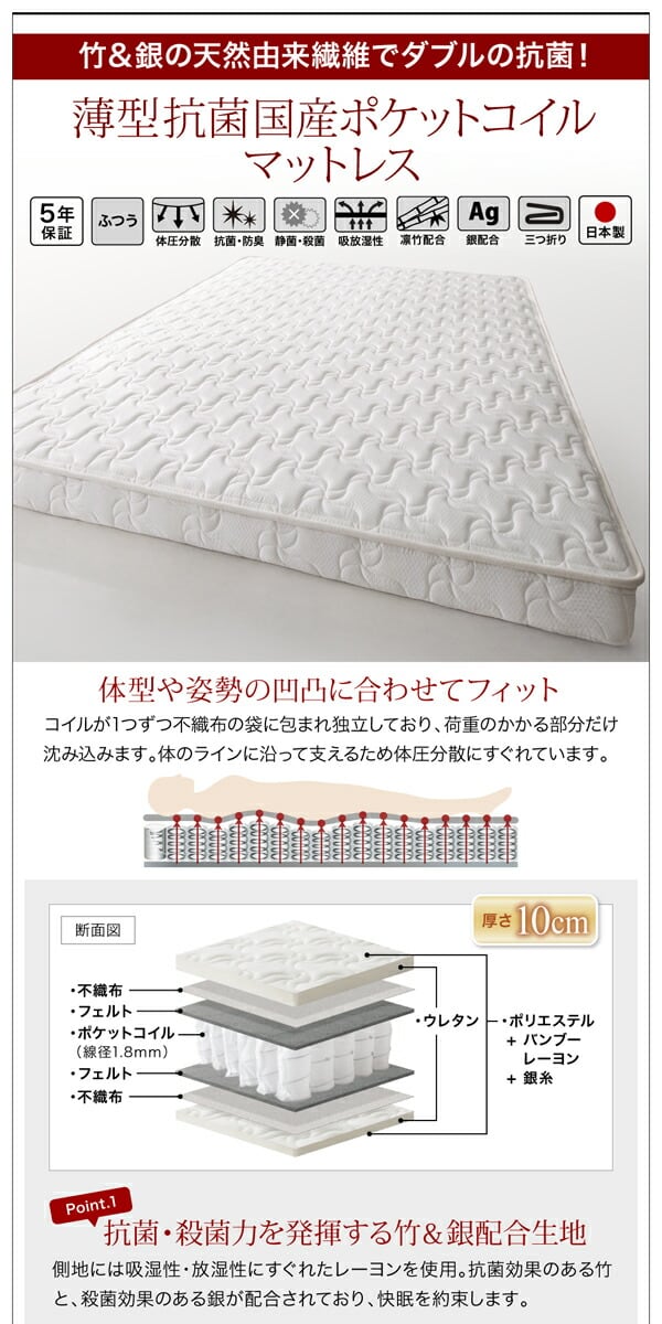 お客様組立 薄型抗菌国産ポケットコイルマットレス付き シングル