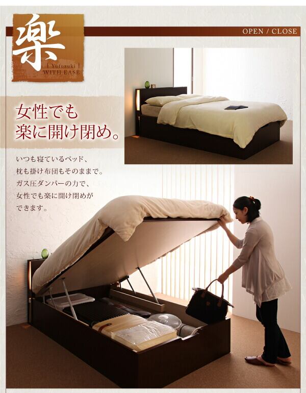 お客様組立 開閉タイプが選べるガス圧式跳ね上げ収納ベッド 薄型プレミアムポケットコイルマットレス付き 横開き セミダブル 深さラージ