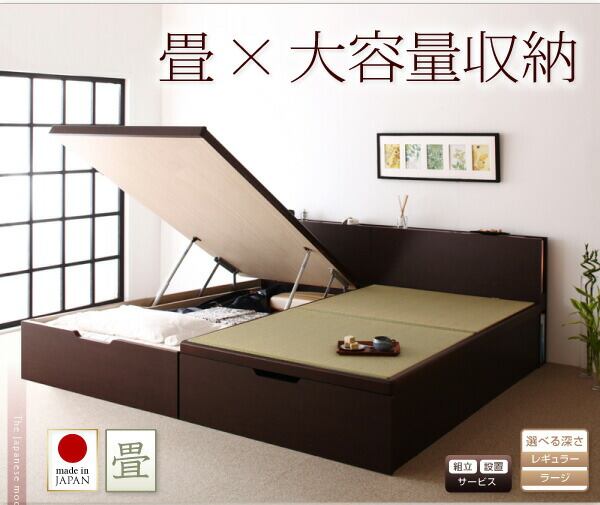 お客様組立 照明・棚付きガス圧式跳ね上げ収納畳ベッド 国産タイプ 縦開き・ベッドガードなし セミダブル 深さラージ