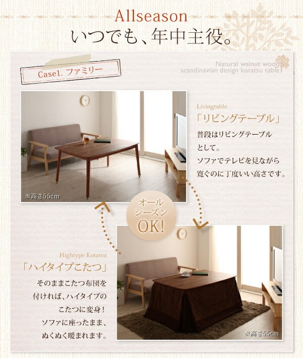 4段階で高さが変えられる 天然木ウォールナット材高さ調整こたつテーブル 長方形(75×105cm)