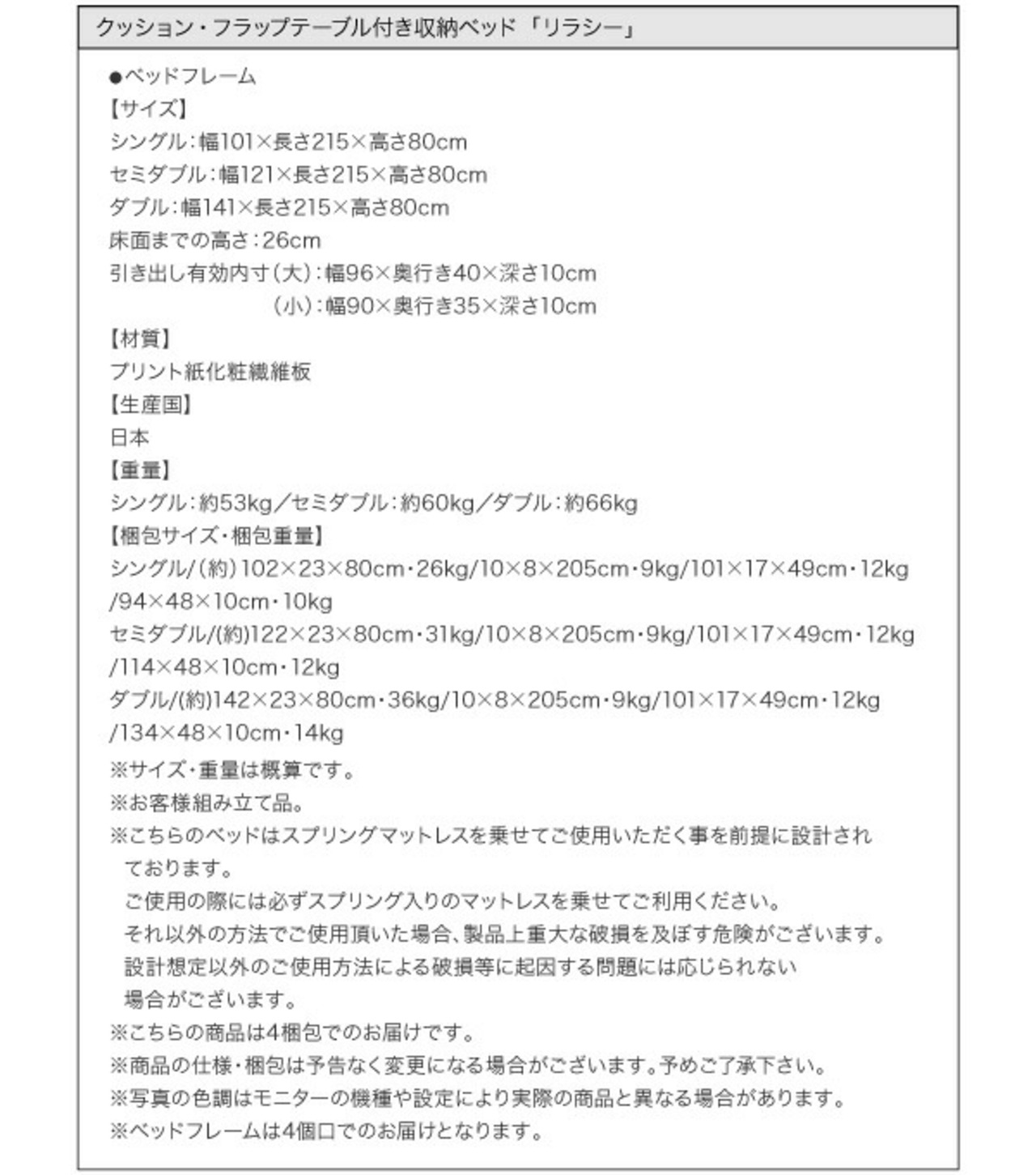 ●ベッド、リビングダイニング、収納家具については【完成品】【組立設置付き】と記載が無い場合はお客様にて組立が必要になります。