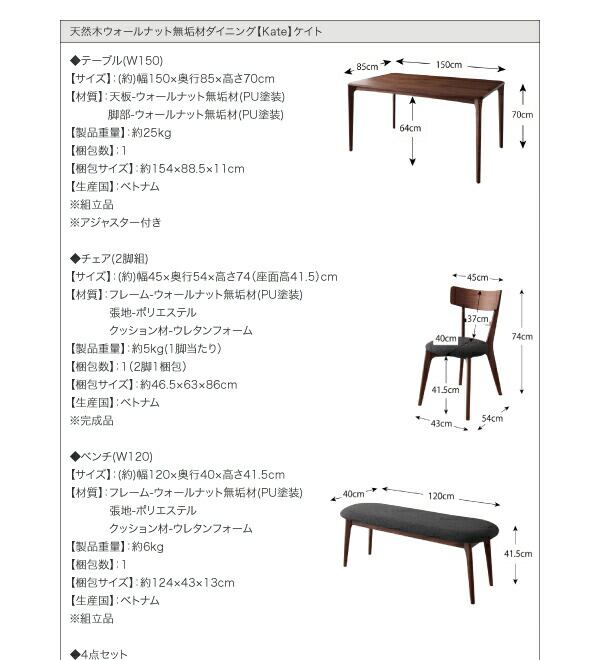 天然木ウォールナット無垢材ダイニング Kate ケイト ダイニングテーブル W150