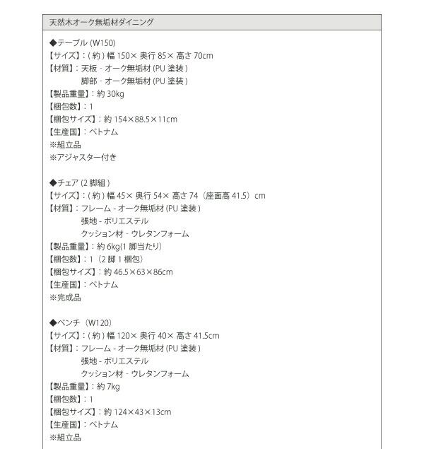 天然木オーク無垢材ダイニング 3点セット(テーブル+チェア2脚) W150