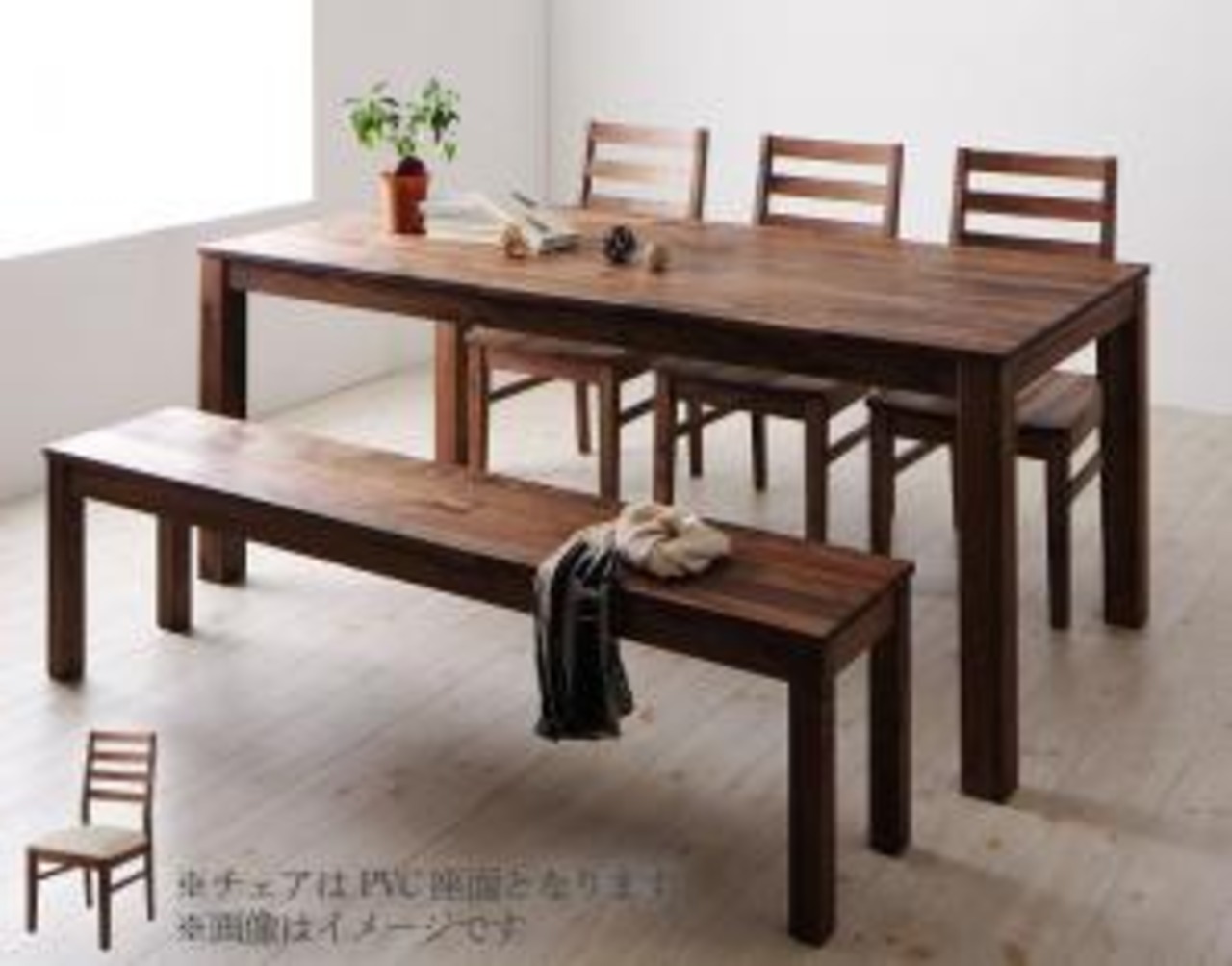総無垢材ダイニング 5点セット(テーブル+チェア3脚+ベンチ1脚) ウォールナット PVC座 W180
