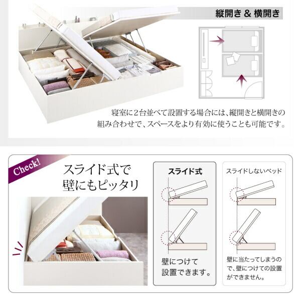 お客様組立 国産跳ね上げ収納ベッド ホワイト 薄型スタンダードポケットコイルマットレス付き 横開き セミダブル 深さグランド