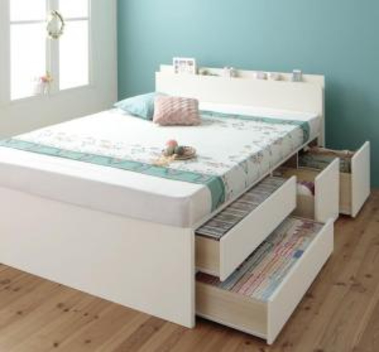 お客様組立 日本製_棚・コンセント付き_大容量チェストベッド 薄型プレミアムポケットコイルマットレス付き セミダブル