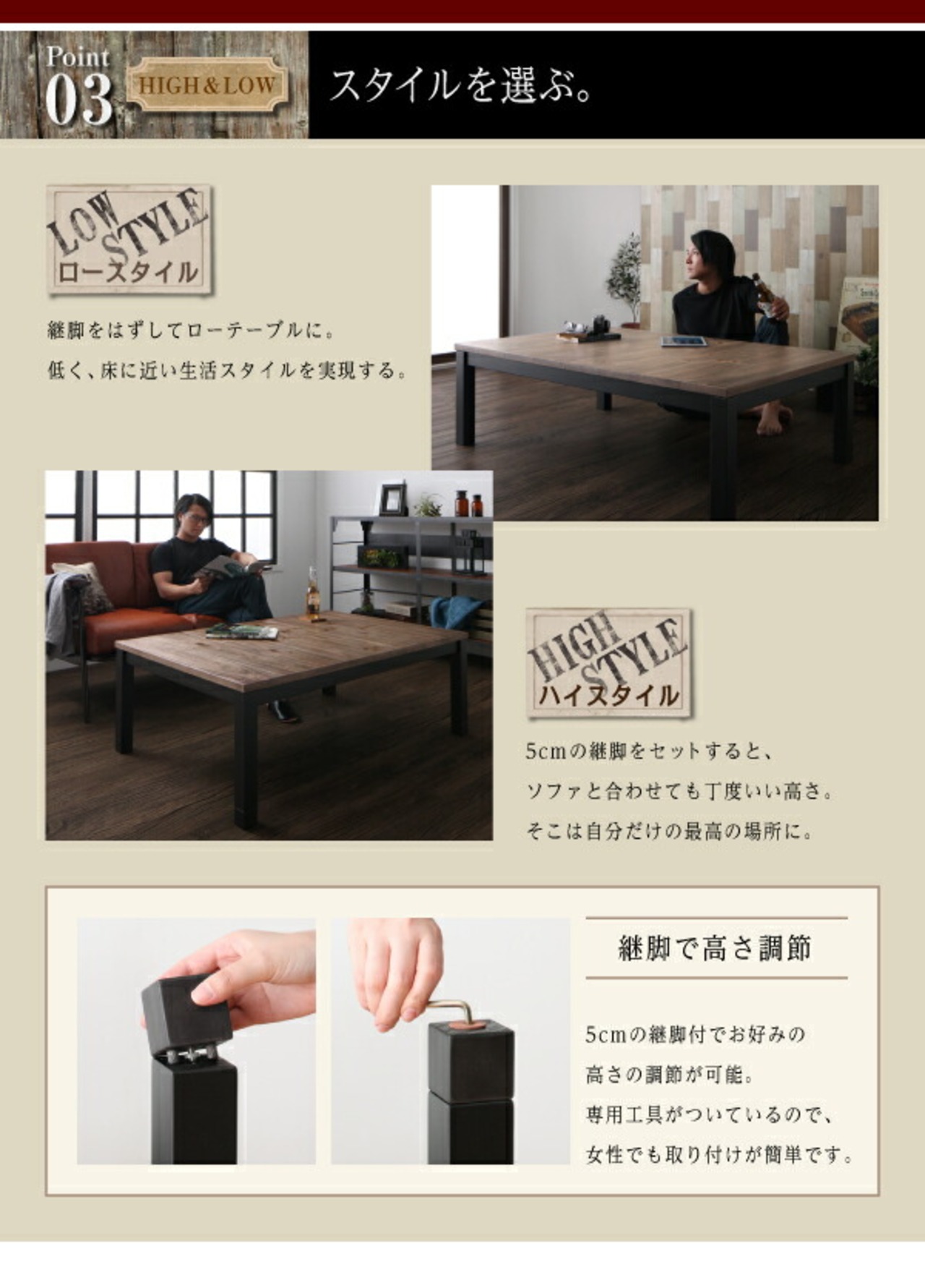 古木風ヴィンテージデザインこたつテーブル 長方形(75×105cm)