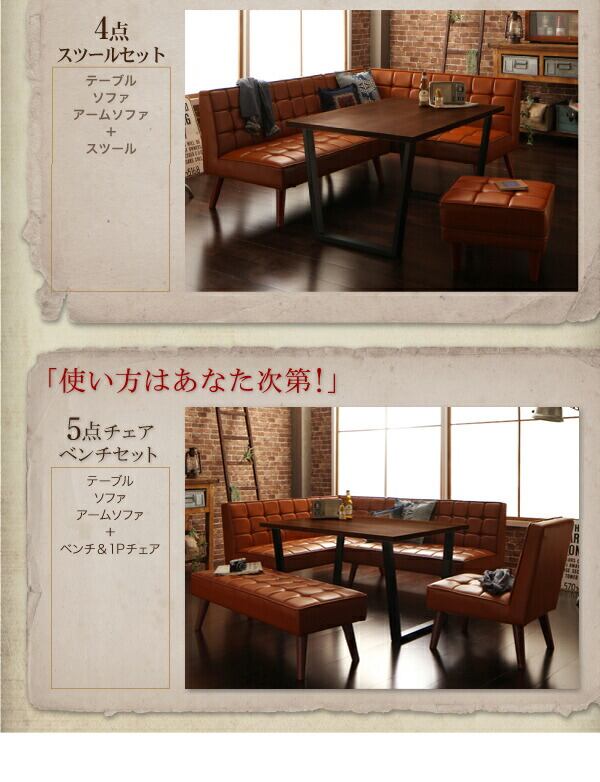 アメリカンヴィンテージ リビングダイニングセット 4点セット(テーブル+ソファ1脚+アームソファ1脚+ベンチ1脚) 右アーム W120