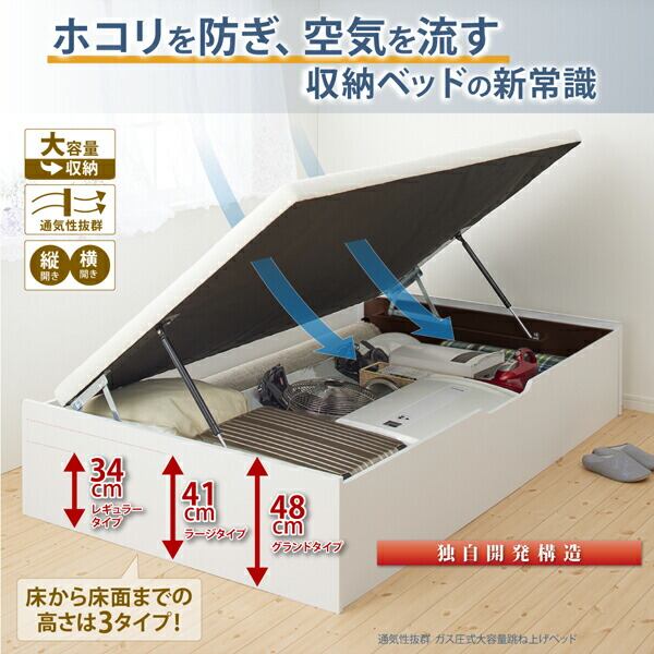 お客様組立 通気性抜群_ガス圧式大容量跳ね上げベッド 薄型スタンダードポケットコイルマットレス付き 横開き シングル 深さラージ