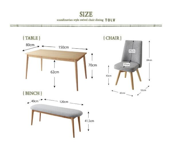 北欧スタイル 回転チェア ダイニング 4点セット(テーブル+チェア2脚+ベンチ1脚) ナチュラル W150