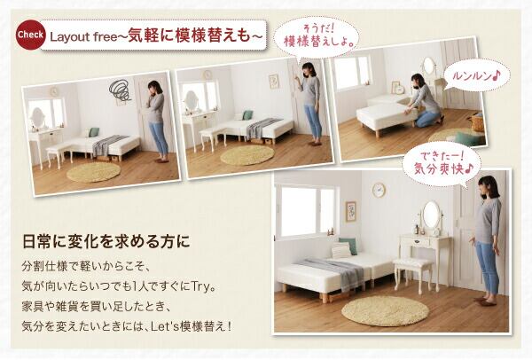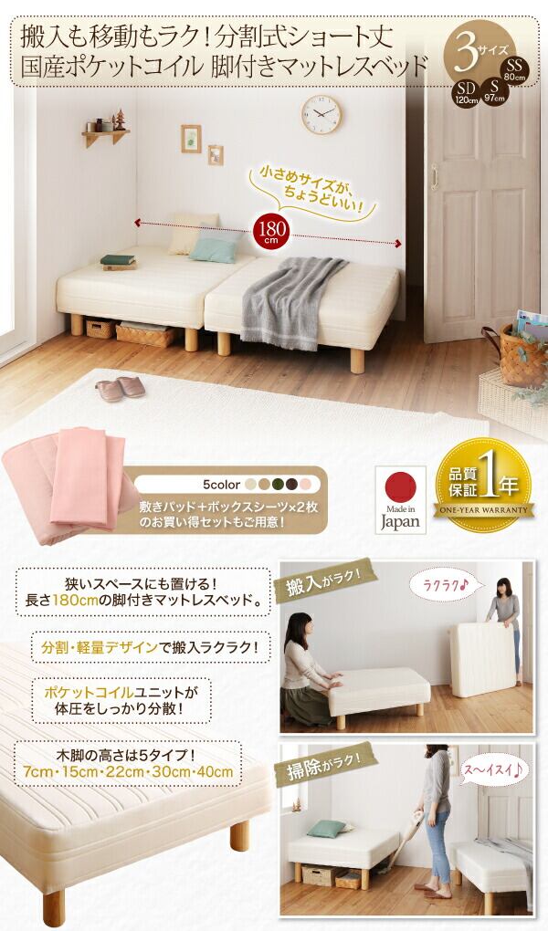 ショート丈分割式 脚付きマットレスベッド 国産ポケット マットレスベッド セミダブル ショート丈 脚7cm