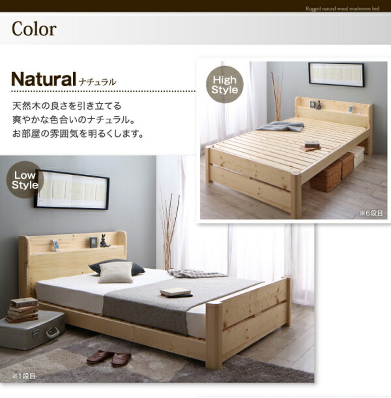 ローからハイまで高さが変えられる6段階高さ調節 頑丈天然木すのこベッド スタンダードポケットコイルマットレス付き シングル