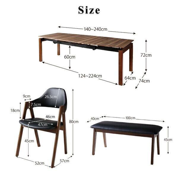 北欧テイスト 天然木ウォールナット材 伸縮ダイニングセット ダイニングチェア 2脚組