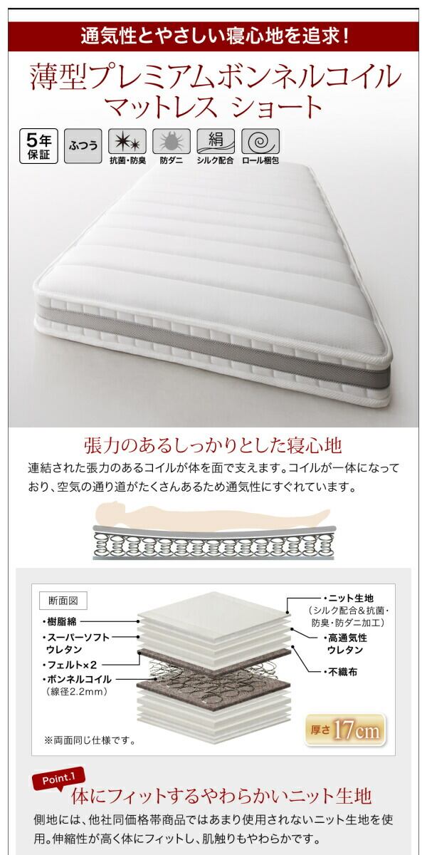 薄型プレミアムボンネルコイルマットレス付き セミシングル ショート丈 深さラージ