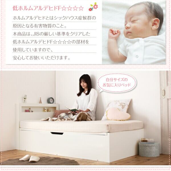 小さな部屋に合うショート丈収納ベッド 薄型抗菌国産ポケットコイルマットレス付き セミシングル ショート丈 深さラージ