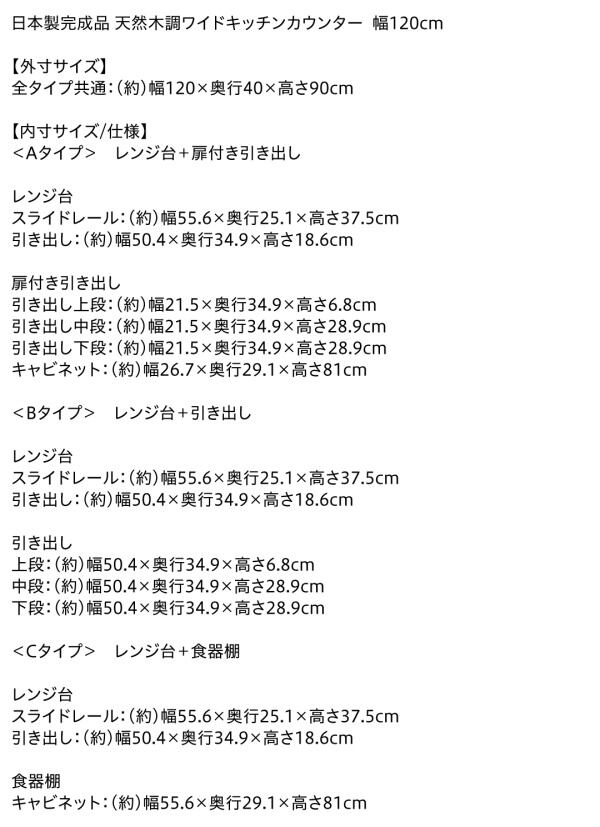 日本製完成品 天然木調ワイドキッチンカウンター レンジ台+引き出し 120cm