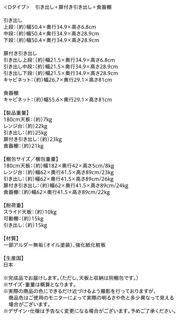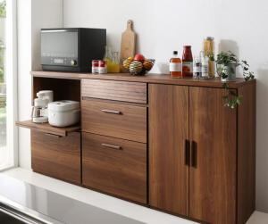 日本製完成品 天然木調ワイドキッチンカウンター レンジ台+引き出し+食器棚