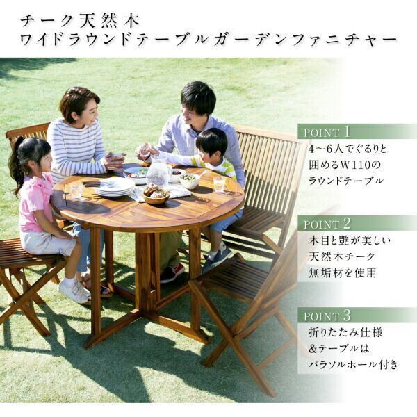 チーク天然木 ワイドラウンドテーブルガーデンファニチャーア 5点セット(テーブル+チェア4脚) チェア肘無 W110