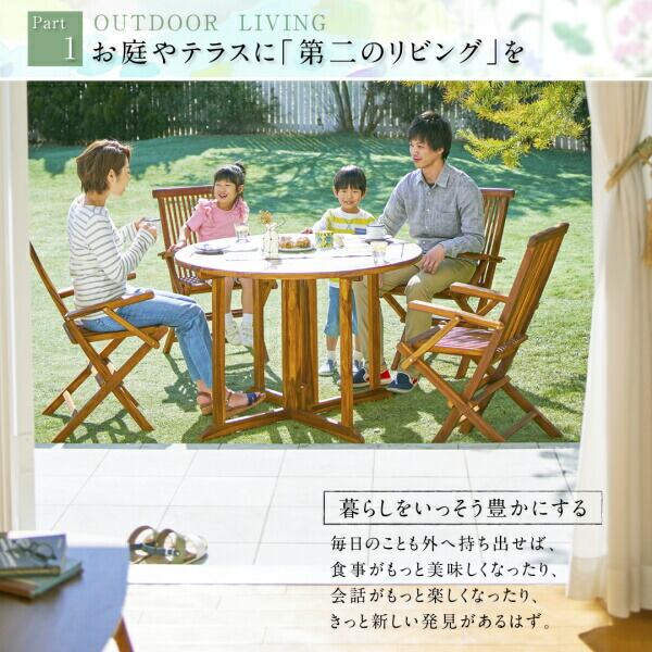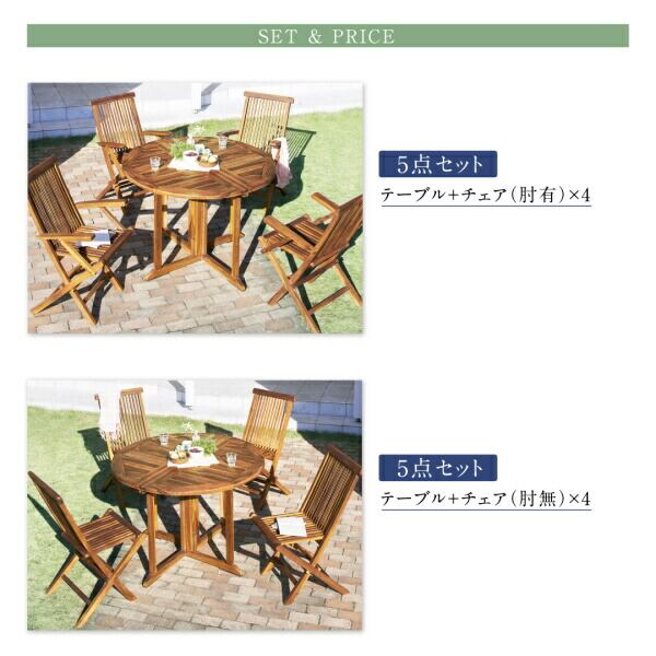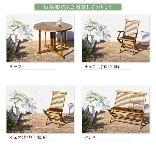チーク天然木 ワイドラウンドテーブルガーデンファニチャーア 4点セット(テーブル+チェア2脚+背付ベンチ1脚) チェア肘無 W110