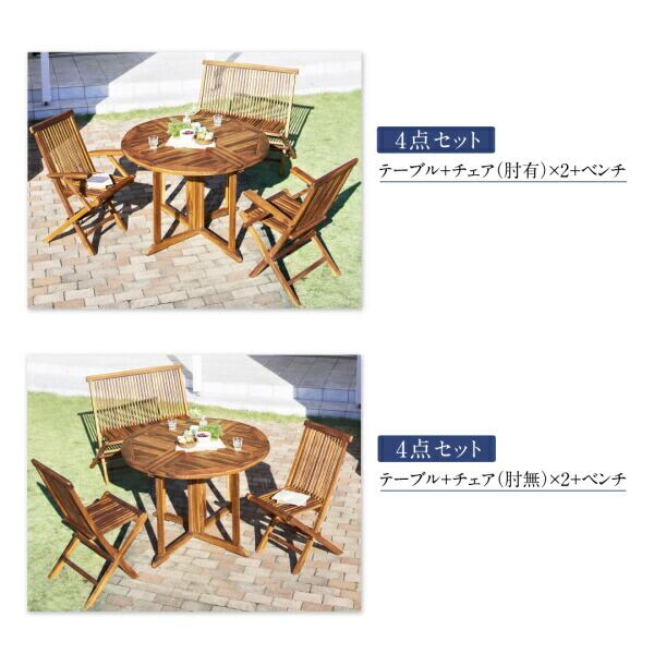 チーク天然木 ワイドラウンドテーブルガーデンファニチャーア ガーデンチェア 2脚組 肘有