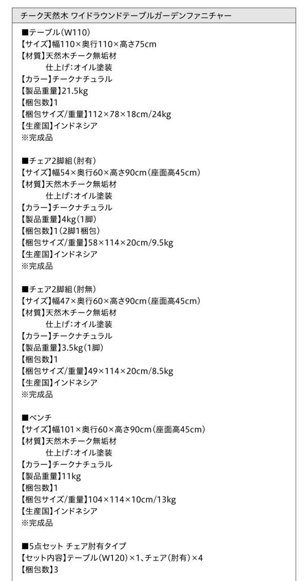 チーク天然木 ワイドラウンドテーブルガーデンファニチャーア ガーデンチェア 2脚組 肘無
