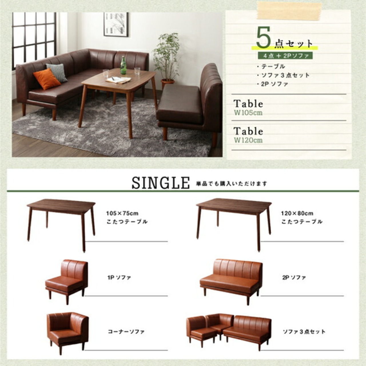 年中快適 こたつもソファも高さ調節 リビングダイニングセット 4点セット(テーブル+2Pソファ1脚+1Pソファ1脚+コーナーソファ1脚) W105