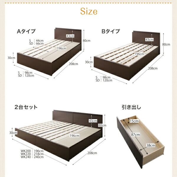 お客様組立 壁付けできる国産ファミリー連結収納ベッド スタンダードポケットコイルマットレス付き A+Bタイプ ワイドK240(SD×2)