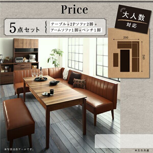 ダイニング 5点セット(テーブル+2Pソファ2脚+アームソファ1脚+ベンチ1脚) 右アーム W120-180