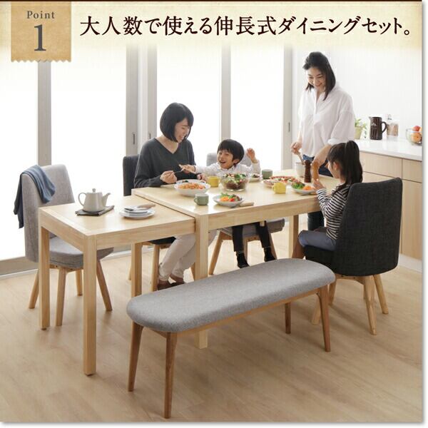 回転イス付き 北欧スライド伸縮ダイニングテーブルセット 6点セット(テーブル+チェア4脚+ベンチ1脚) W120-200