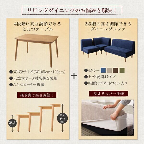 年中快適 こたつもソファも高さ調節 リビングダイニングセット 6点セット(テーブル+2Pソファ1脚+1Pソファ2脚+コーナーソファ1脚+ベンチ1脚) W105