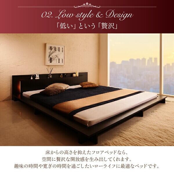 モダンライト・コンセント付き大型ローベッド プレミアムポケットコイルマットレス付き キング
