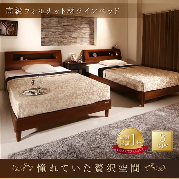 高級ウォルナット材ツインベッド ボンネルコイルマットレス付き ツイン(SD×2)