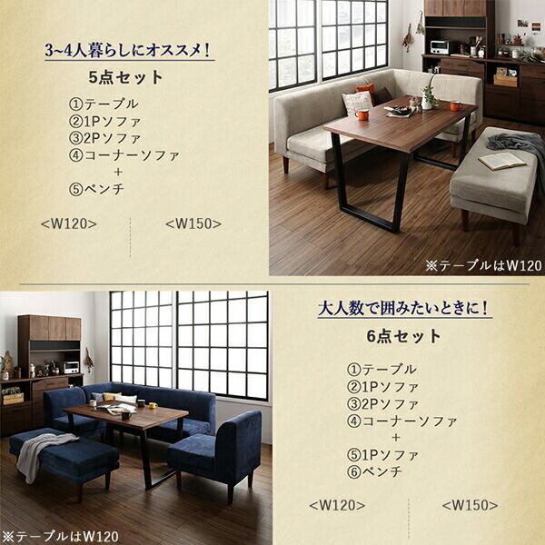 5点セット(テーブル+2Pソファ1脚+1Pソファ2脚+コーナーソファ1脚) W150