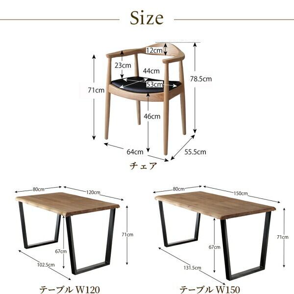 天然木オーク無垢材の高級デザイナーズダイニング 3点セット(テーブル+チェア2脚) W150