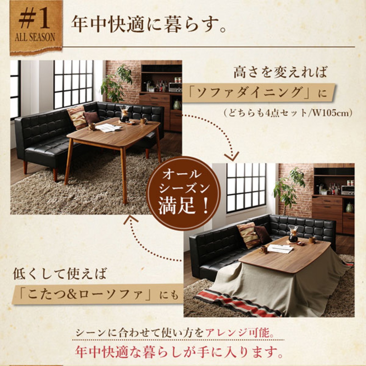 こたつもソファも高さ調節ヴィンテージリビングダイニング 4点セット(テーブル+ソファ1脚+アームソファ1脚+チェア1脚) 右アーム W120