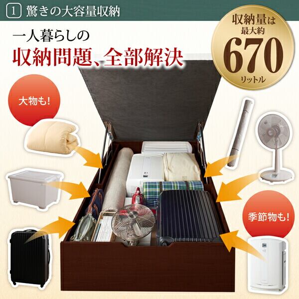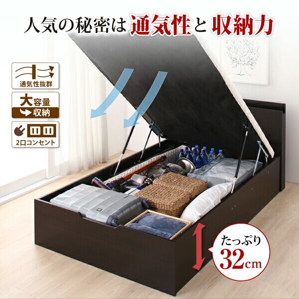 お客様組立 通気性抜群 すのこ構造 棚コンセント付 跳ね上げベッド スタンダードポケットコイルマットレス付き シングル 深さラージ