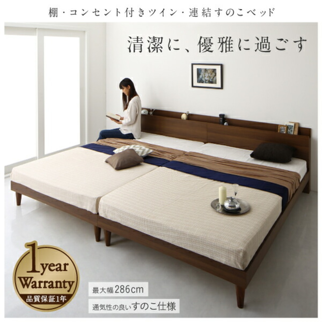 棚・コンセント付きツイン連結すのこベッド 国産カバーポケットコイルマットレス付き ワイドK280