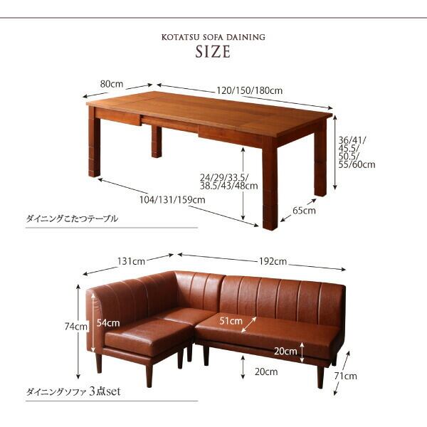 6段階高さ調節 伸縮式こたつ 大型ソファダイニング 3点セット(2Pソファ1脚+1Pソファ1脚+コーナーソファ1脚) 1P×2+2P