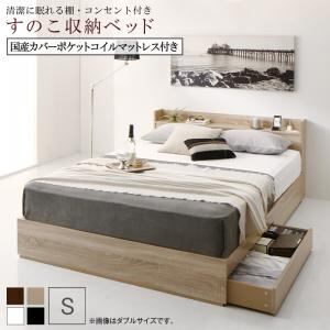 清潔に眠れる棚・コンセント付きすのこ収納ベッド 国産カバーポケットコイルマットレス付き シングル