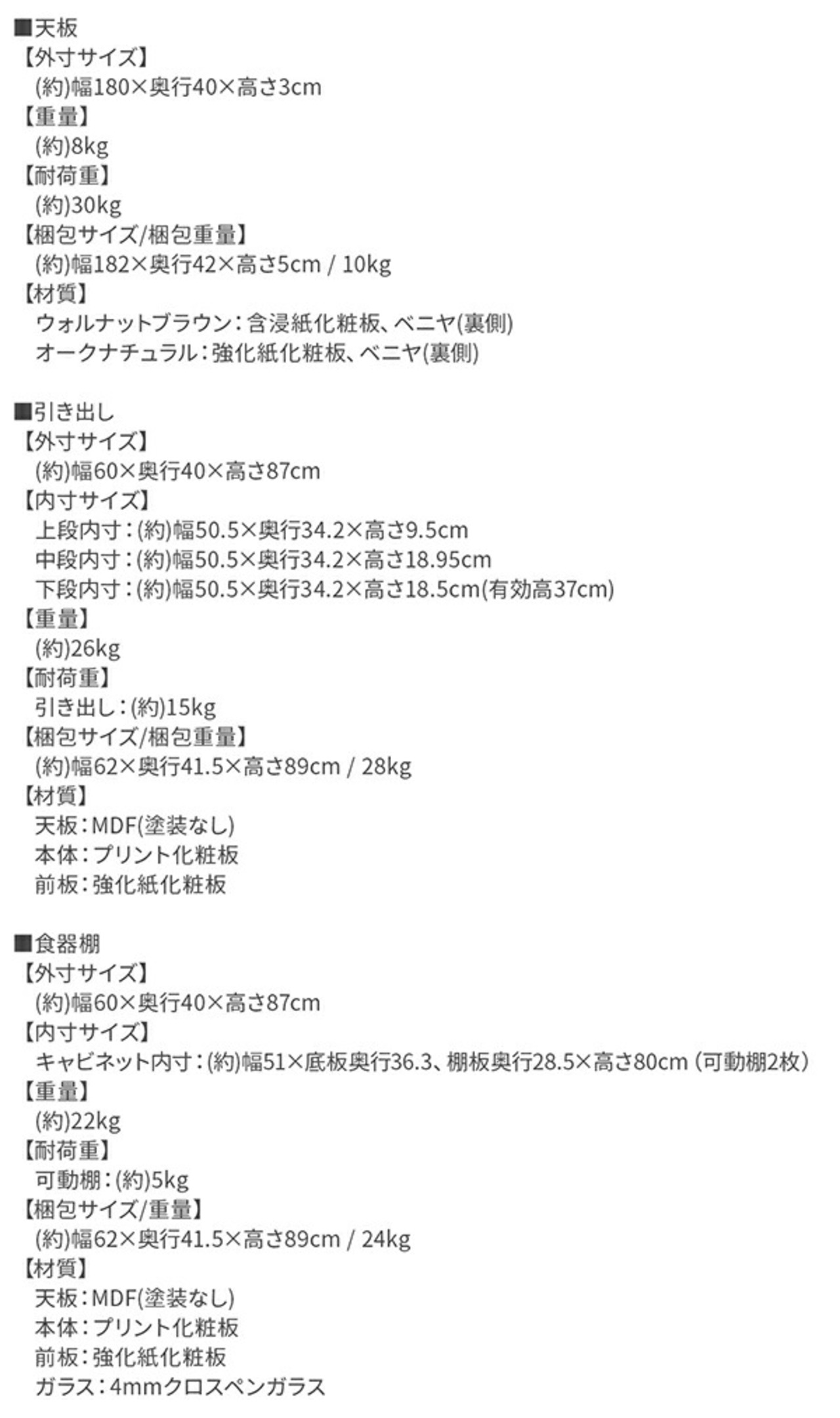 日本製完成品 幅180cmの木目調ワイドキッチンカウンター 2点セット 引き出し+引き出し