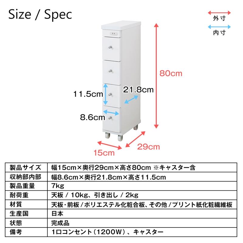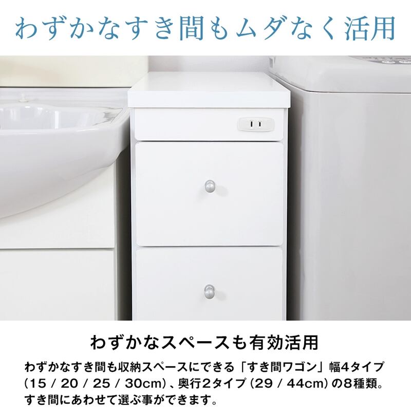 すき間ワゴン すきまワゴン 洗面所 ランドリー 収納 日本製 完成品 キャスター付き コンセント 洗面所 ランドリー スリム ホワイト 白 幅15cm 奥行29cm